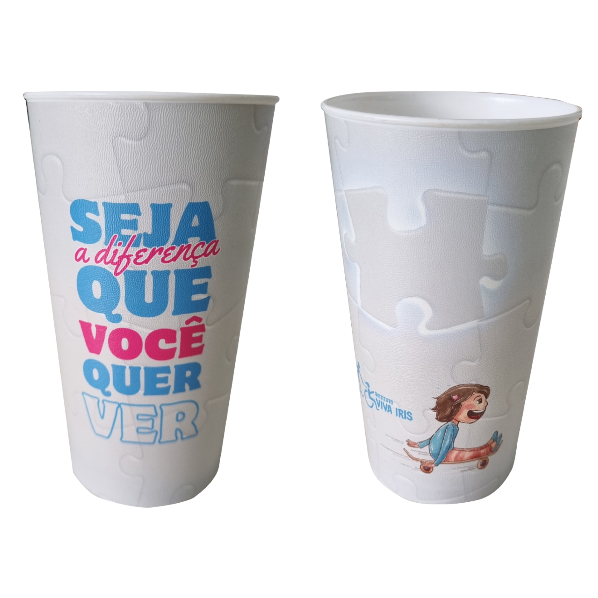 Copos personalizados estampados na cor branca do Instituto Viva Iris com a frase "Seja a diferença que você quer ver ! " na parte frontal e na parte traseira com a logo do instituto e a Titi no skate.